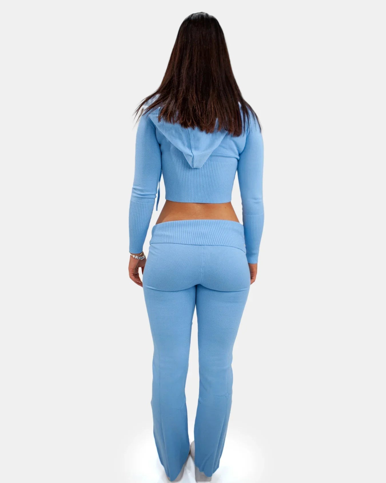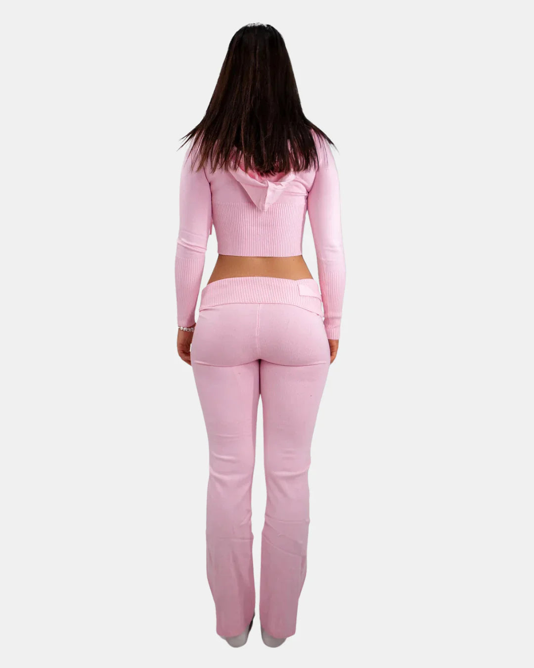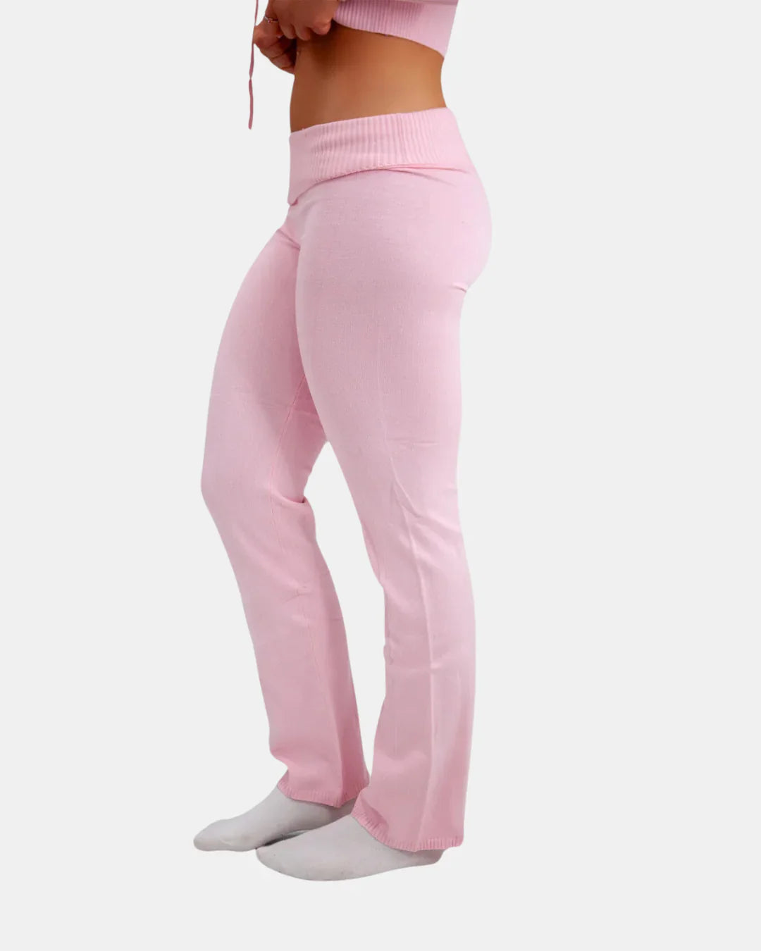 • Retro Flare : Le pantalon taille basse légèrement évasé crée le mélange parfait de cosy et de tendance, avec une touche rétro.